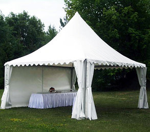 Шатер Пагода- площадь 25м2 (5м х 5м) , материал стойки анодированный алюминий, материал крыши водонепроницаемый, ПВХ (блокаут), толщина 550-850гр\см, белый, стенки водонепроницаемый, огнеупорный ПВХ, толщина 550гр/см, белый. Боковые стены вешаются на пластиковых петлях, по середине вертикально разделены по-полам на молнии, возможность раздвигать и собирать как шторы. Высота стенки 2,20 м, высота в коньке 5,10 м. Крыша вытянута вверх с помощью резьбовой ручки, крепится к каркасу при помощи стальных шпилек, что позволяет осуществить хорошую натяжку тента для устойчивости при ветре и дожде. При необходимости все стенки могут подниматься.
